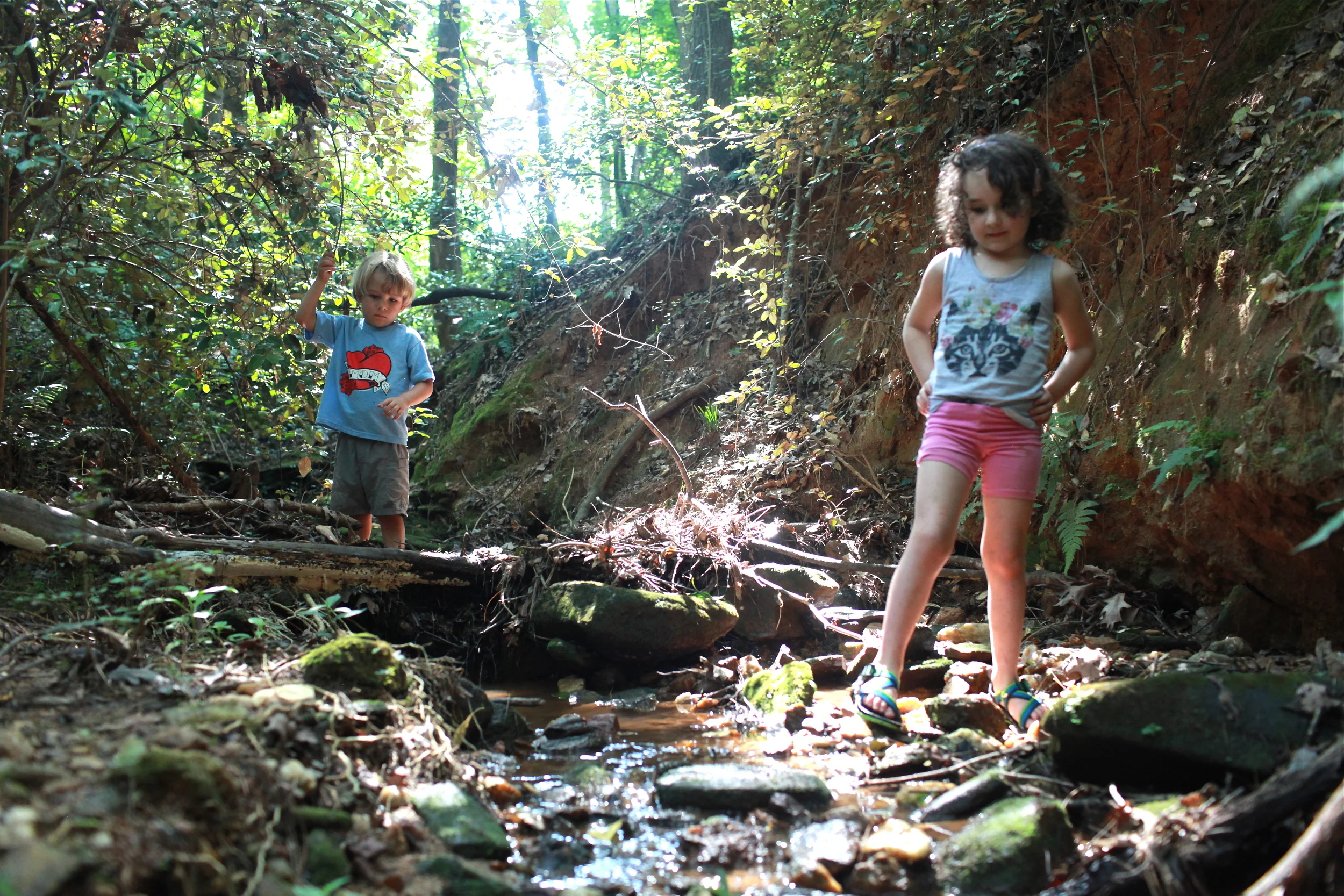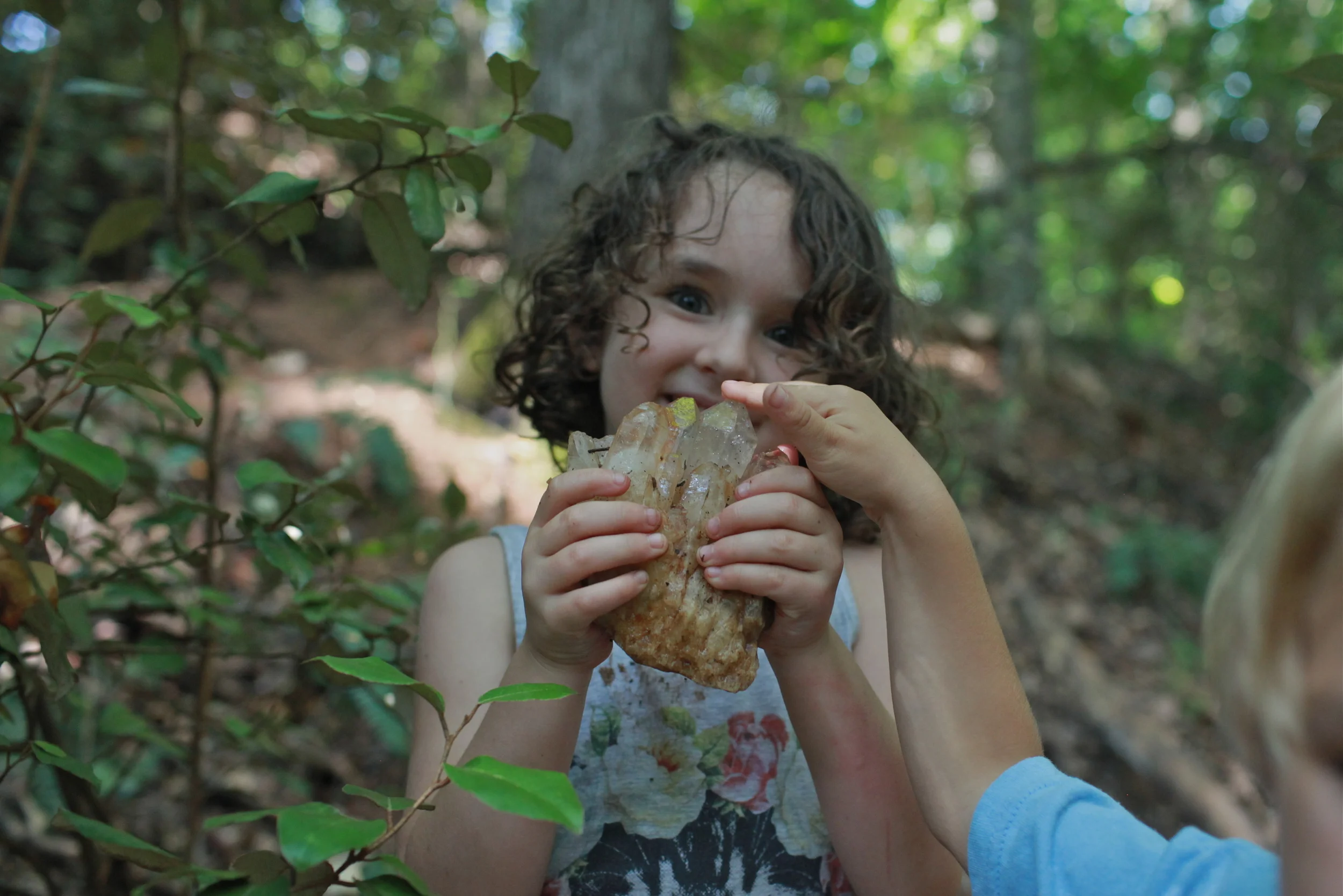 Our group hiked for about an hour, Meriwether, ever the champ, on my back. I was also impressed with the gusto of both Singer and Silas. They are typically hiking champions, but without a clear path there was a lot of climbing to do and brush to maneuver. We found so many treasures for our nature table, a 2 pound quartz (pictured above), an owl feather, some leaves, a few pine cones and acorns. We saw many animals in the stream including a few salamanders and a crawfish. There were deer tracks and scat a plenty.