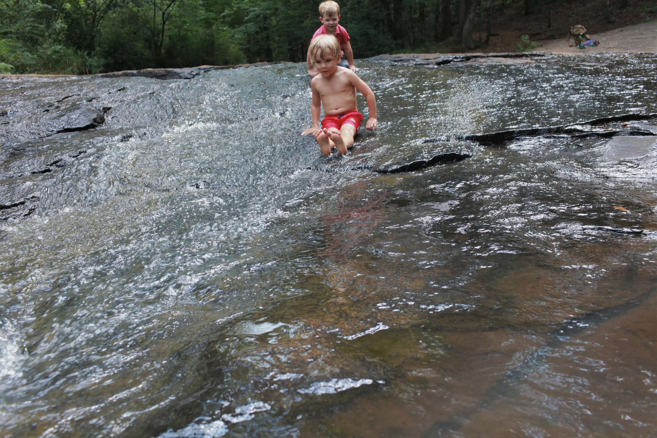 As a child I have fond memories of spending days sliding down Flint Rock in Columbus, Georgia. When visiting Watson Mill David and I have often commented that rock sliding seems much more dangerous than it ever did as youngsters. Now it's our children's turn and they seem about as phased by the slipperiness of wet rocks as we once were, not to mention just as fluid and limber. Note to parents of the smallest children: I left my carriers in the car and that was a no go. Meriwether (1yr) wanted to slide just as much as Singer (5) and Silas (3) did, so a carrier is a must for the younger crowd.