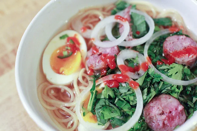 We like our pho topped with a rare thinly sliced beef cut, as well as basil, lime, jalapenos, onions, cilantro, and Siracha.
