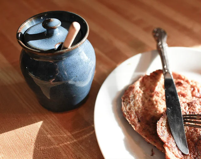 This recipe works best with a runny starter for my taste buds. On average I keep my sourdough starter considerably less thick than others, I think it produces lighter biscuits and pancakes- which is what I strive for. I recommend feeding your starter the night before with more water/less flour than you usually would. Unless you get to know your starter like I have and keep it that way anyhow. The consistency shouldn't be watery, but should also freely drip off your spoon instead of plopping off of it.